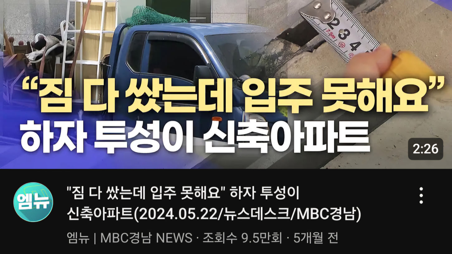 최근 부실시공으로 인한 하자 사례가 속속 보도되고 있습니다. [기사 캡처: 시공사 부실로 인한 결함 사례] 입주 후 발견된 결함은 해결까지 시간이 오래 걸리고, 비용 부담도 큽니다. 이제는 사전점검이 필수입니다. 저희 프로체크는 철저한 점검으로 시공상의 결함 을 미리 발견하고, 안전한 입주를 돕습니다.